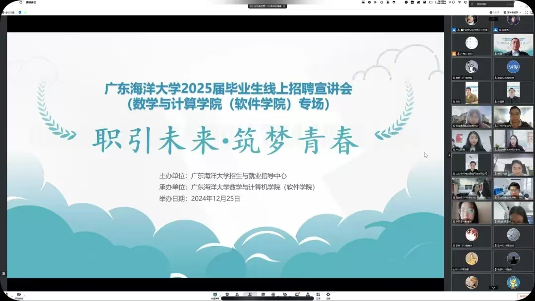 为全面落实党中央、国务院关于实施就业优先战略促进高质量充分就业的意见、广东省高校毕业生就业工作会议精神和公司就业工作要求,2024年12月25日,公司通过腾讯会议在线上成功举办ladbrokes立博专场校企交流会暨2025届毕业生线上招聘宣讲会,会议由公司正处级辅导员、党委副书记农康主持,共计有十余家企业,二百余名员工参加。